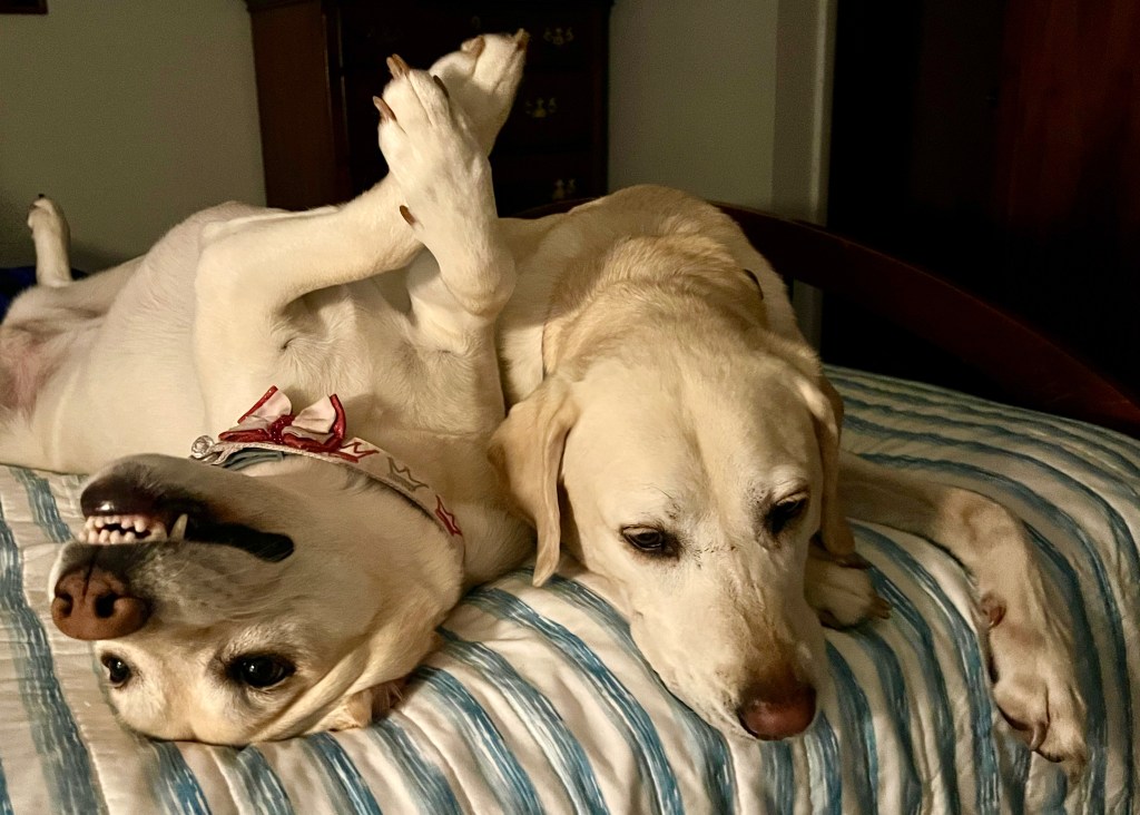 The dogs. Our beloved dogs. They are the joy in our little end of the world. They join us in the garden, troop out to the apiary… and greet everyone who comes to the house. They are yellow labs and the sweetest pups you will ever meet.